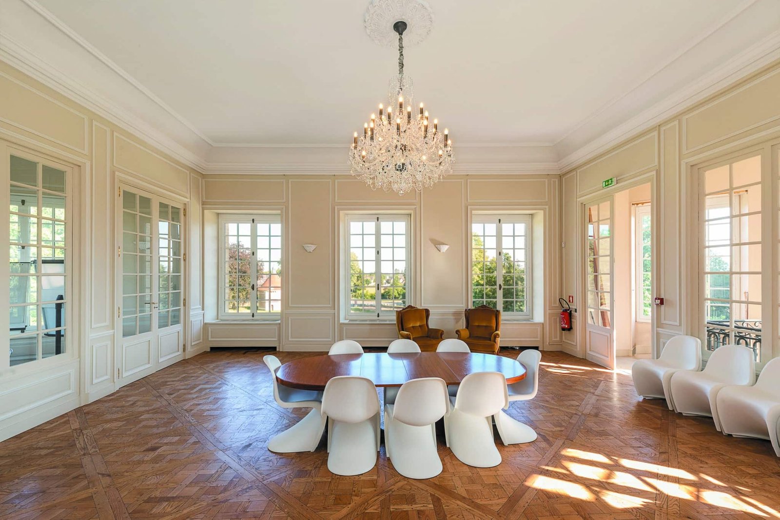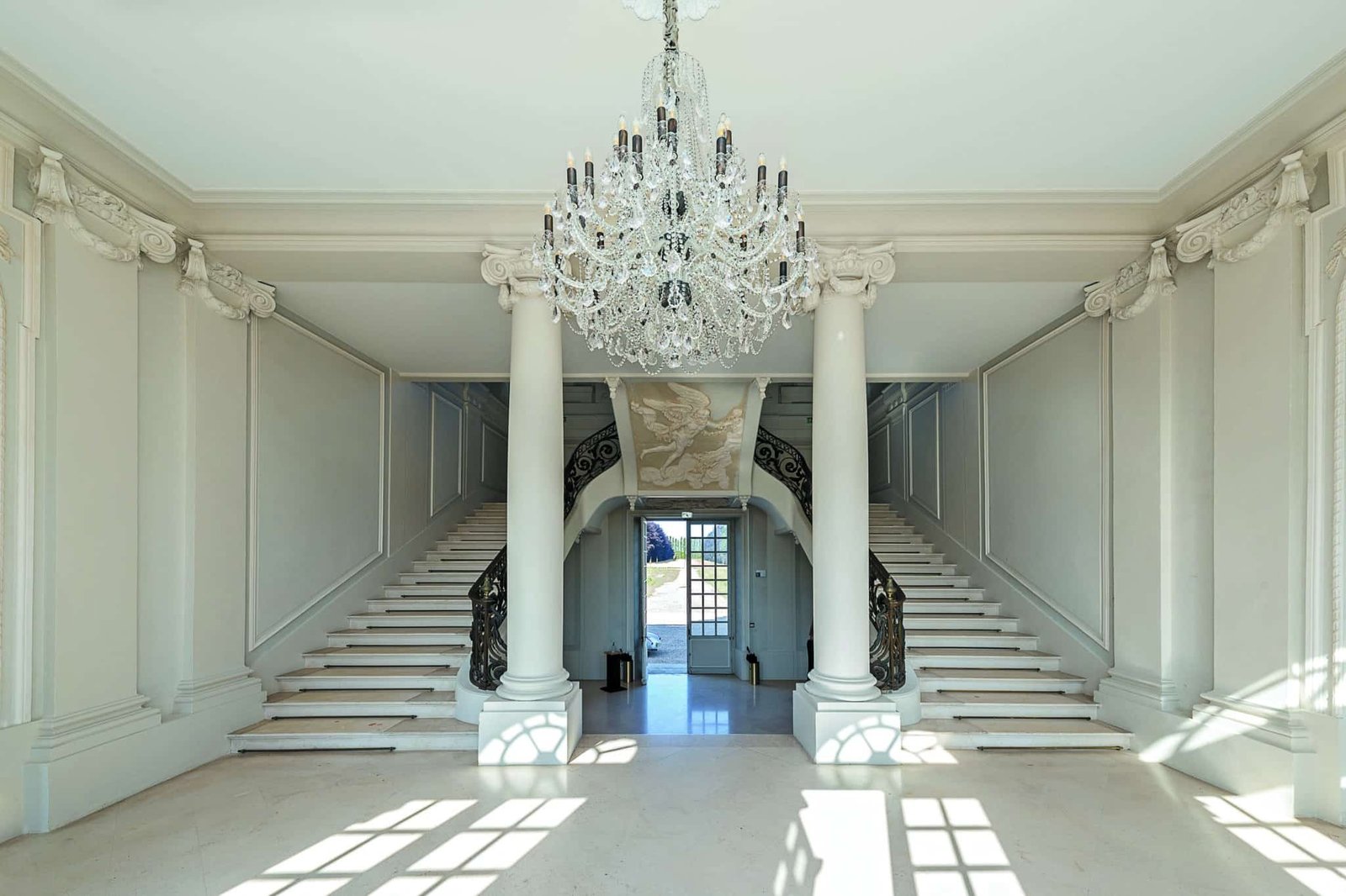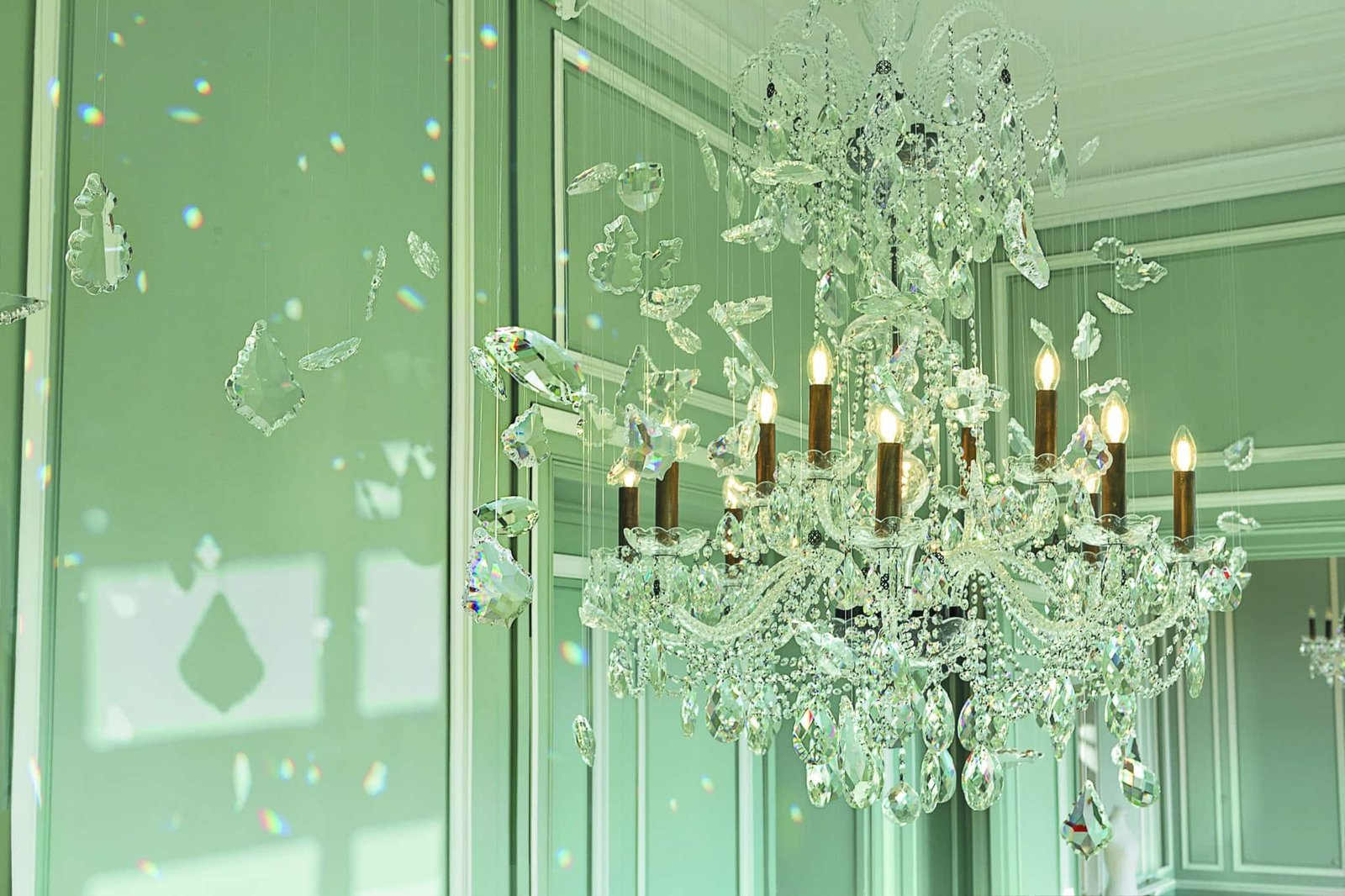 Lighting project carried out at the Château de Belbeuf, property of the society Paul Marius. Magnificent project of 18 bespoke crystal chandeliers designed especially for Paul Marius and made by hand with very fine quality crystal.As the final bouquet of this magnificent project of 18 hand-cut crystal chandeliers, the chandelier on the main staircase, 3 meters high and 2 meters in diameter, composed of more than 40,000 elements of hand-cut crystal and 85 lights.