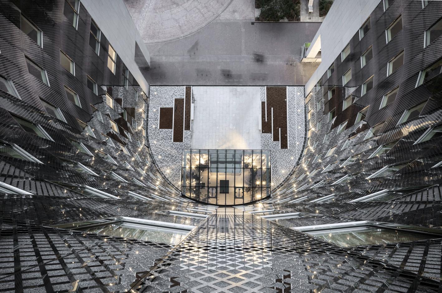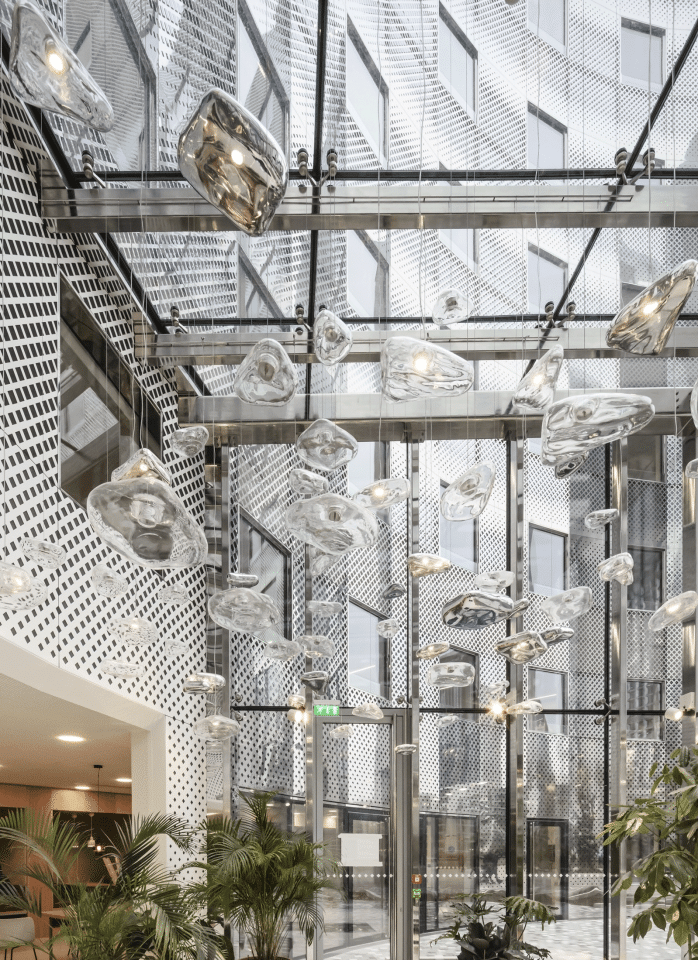 Des galets en verre transparents flottent comme des bulles d’air et de mercure sous une verrière de 10 mètres de hauteur. Cent éléments en verre, pour certains métallisés, d’autres électrifiés, composent ce lustre monumental imaginé par Isa Moss conjointement avec l’architecte Axel Schoenert.