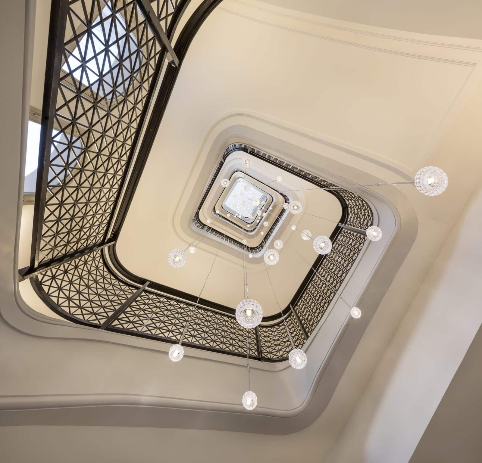 A deux pas des champs Elysées, nous avons réalisé un lustre d’escalier de 23 mètres, composé de 110 éléments de cristal spécialement dessinés et fabriqués pour ce