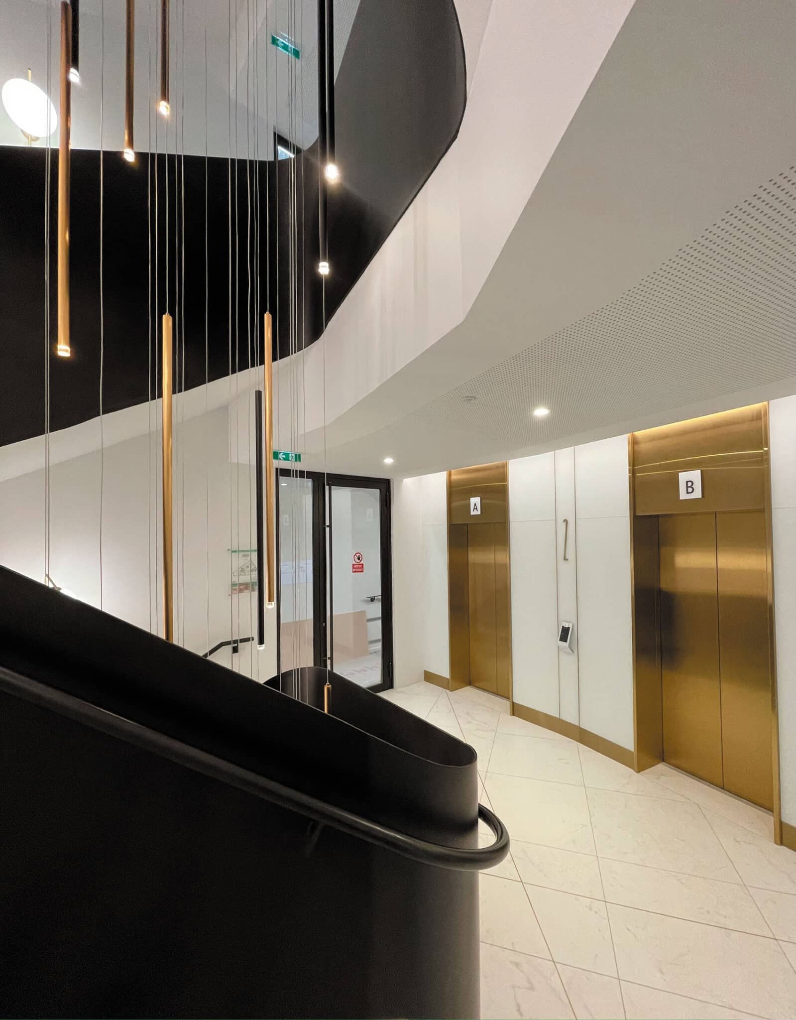 Projet de 28 modules en aluminium laqué noir extra mat, équipés de doubles rubans led de 28.8 watts par mètre, finis par des réflecteurs opalescents. L’ensemble du projet