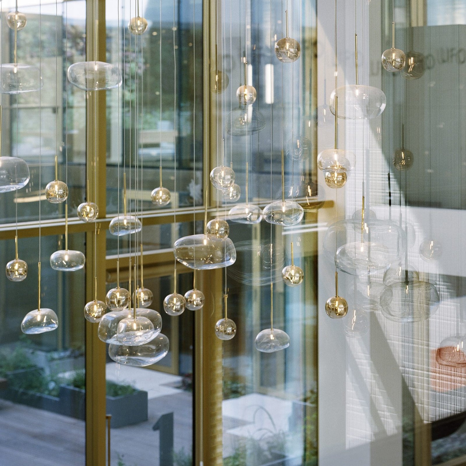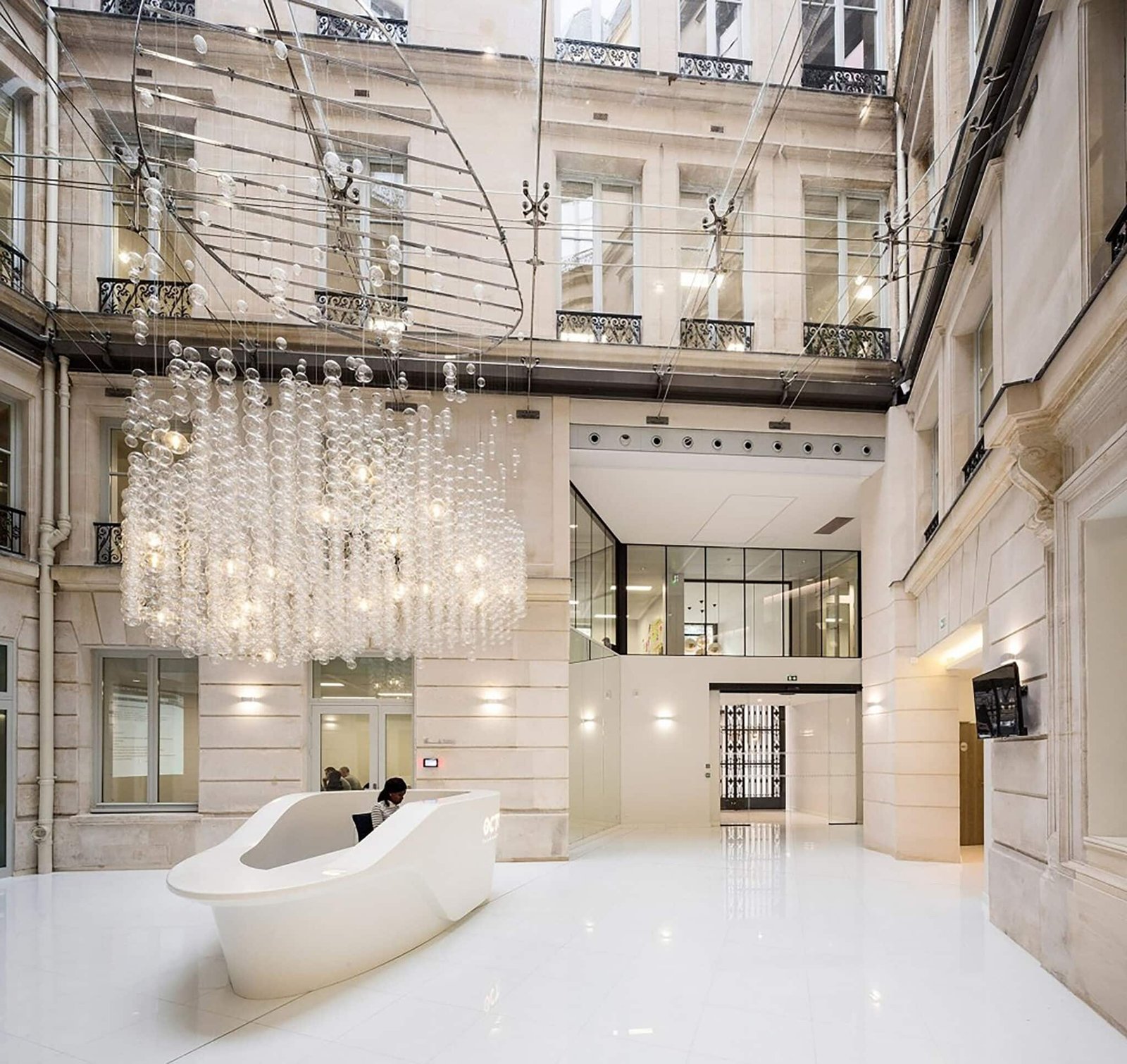 Lustre sur mesure réalisé à partir d’une structure ovoïde en acier chromé, positionnée à 9 mètres, sur torons à l’horizontal sous verrière, composé de 2500 bulles de